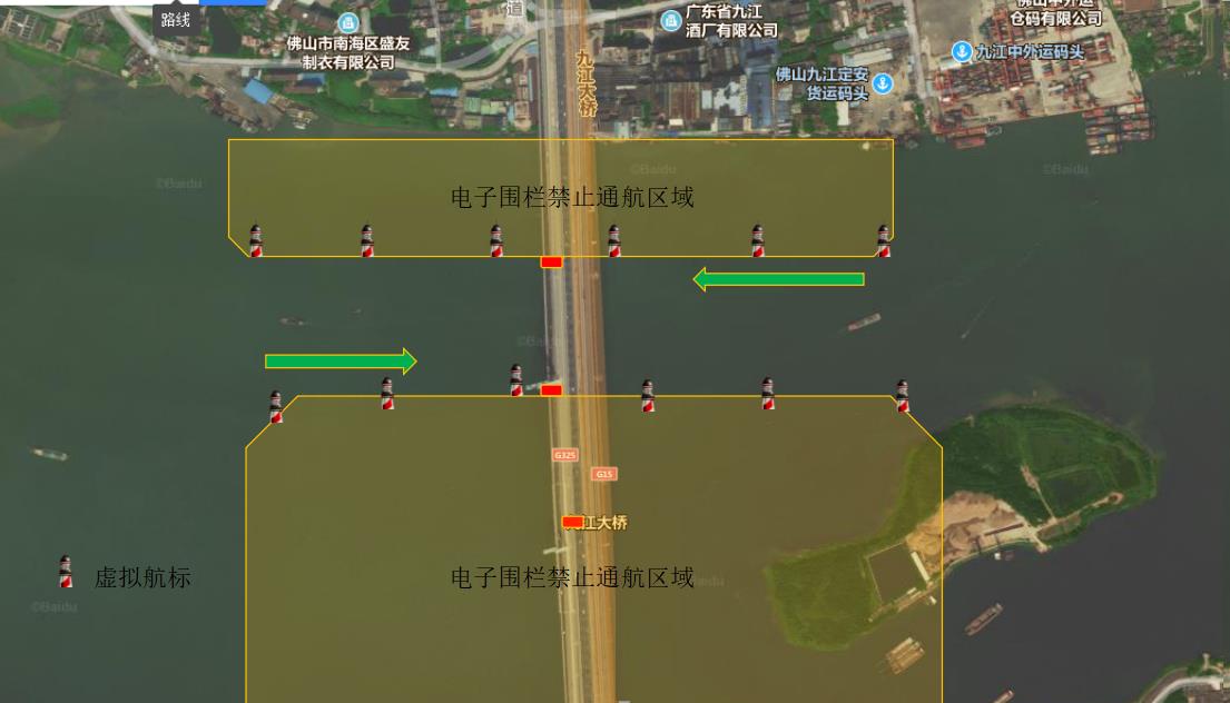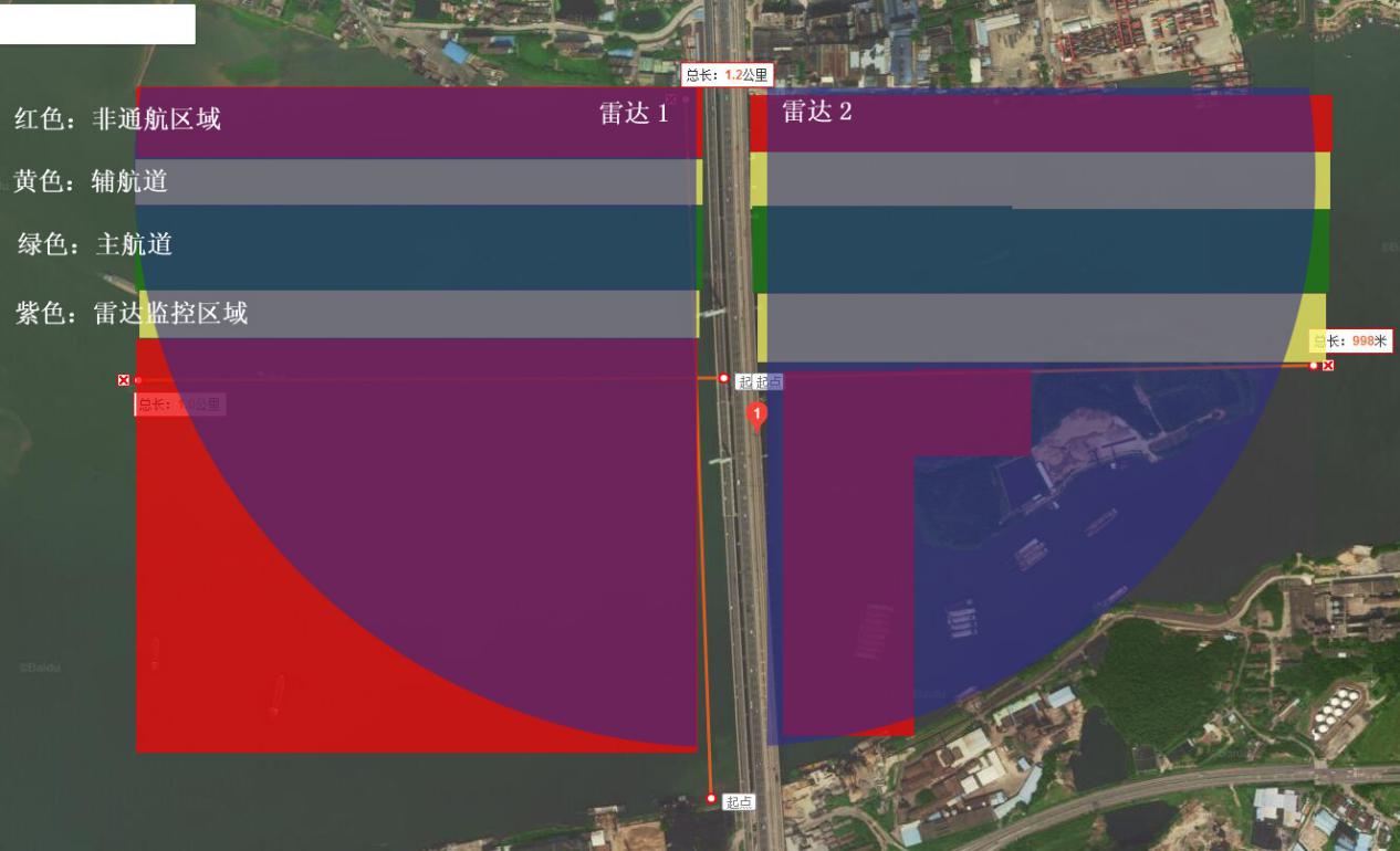 系統(tǒng)把大橋上下游400米內(nèi)的非航道區(qū)域設置為電子圍欄偏航檢測區(qū),一旦檢測到船舶進入