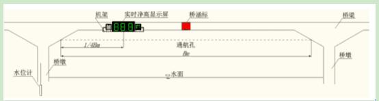 LED顯示屏安裝在通航孔上方面對來船方向,距橋墩約1/4通航孔凈寬處,若有來船,顯示屏會實時同步水位的數(shù)據(jù),顯示當前通航的凈高。而此顯示屏由圖案顯示屏、數(shù)字顯示屏、字母顯示屏及支架組成。設計在橋梁通航孔上下游方向迎船面安裝遙控LED顯示標志,效果如下圖所示: