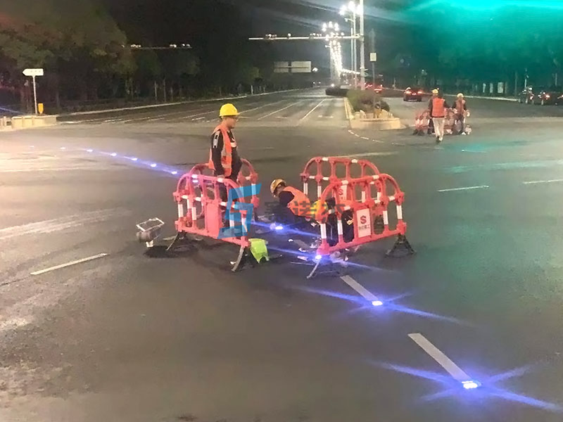 了解到這個難點與痛點以后,我司將原來給歐洲機場的一款發(fā)光有源道釘通過光學設(shè)計改型以后,用在深圳市紅荔路的6個主要十字路口,在接受信號機左拐綠燈信號后,通過白光形成導流線,較好地解決了十字路口導流線晚間亮度不夠的問題。