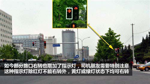 注:這里需要特別說明的是,右轉(zhuǎn)信號(hào)的為箭頭形標(biāo)識(shí),此標(biāo)識(shí)為紅燈時(shí)需要停車等待,無此箭頭燈的情況下右轉(zhuǎn)無需等待,不過個(gè)別路口右轉(zhuǎn)信號(hào)等設(shè)置的并不起眼,這就需要我們?cè)谕ㄟ^路口時(shí)提前減速注意觀察。