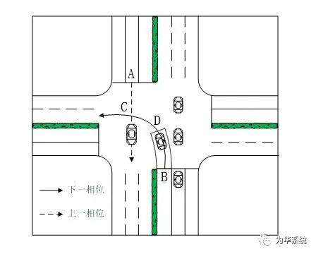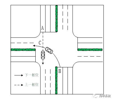 不同相位放行順序,決定車輛到達(dá)沖突點(diǎn)的時(shí)間不盡相同,需要設(shè)置全紅信號(hào)的時(shí)長也不同。以直行和左轉(zhuǎn)車流沖突為例,兩車沖突點(diǎn)在C點(diǎn),A車到C點(diǎn)的距離比B車要短,即A車比B車早通過沖突點(diǎn)。如果采取先直行后左轉(zhuǎn)的放行方式,則交叉口只需要設(shè)置較小的全紅時(shí)間;反之,如果該交叉口采取先左轉(zhuǎn)后直行的放行方式,則需設(shè)置較大的全紅時(shí)間,這種放行方式提高了交叉口的損失時(shí)間,降低了通行效率。