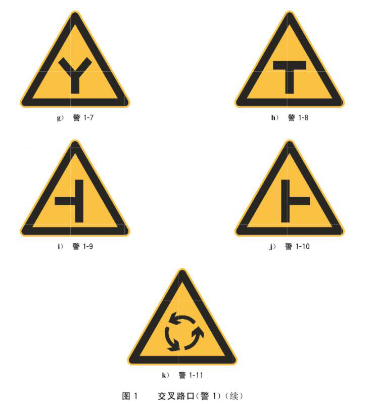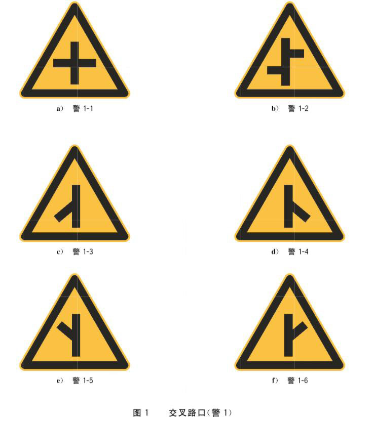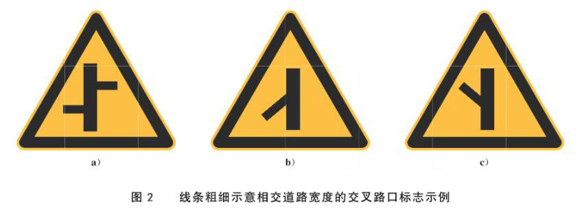 交叉路口警示標(biāo)志用以警告車(chē)輛駕駛?cè)饲胺接薪徊媛房?,注意橫向來(lái)車(chē)。根據(jù)實(shí)際道路交叉的形式盡量選用圖1的圖形。被交路比當(dāng)前道路窄時(shí),可用圖形中的線條粗細(xì)示意相交道路的寬度,示例見(jiàn)圖2。