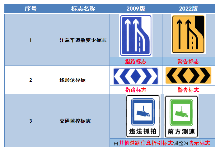 根據(jù)實(shí)際道路交通環(huán)境和應(yīng)用需求,同時(shí)結(jié)合2009版原國(guó)標(biāo)使用情況,2022版新國(guó)標(biāo)對(duì)以下道路交通標(biāo)志的種類(lèi)進(jìn)行了修改,主要修改標(biāo)志如下: