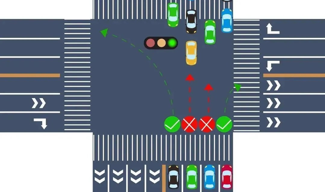 在綠燈情況下,直行車輛未讓行上一個(gè)紅綠燈期間,遺留在路口的左轉(zhuǎn)彎車輛,可能造成轉(zhuǎn)彎車輛滯留擁堵,同樣屬于“闖綠燈”行為。