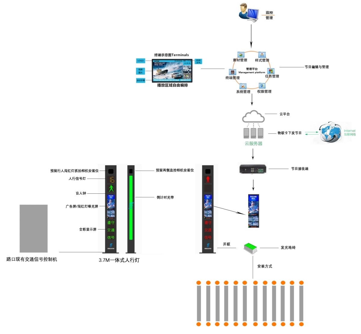 系統(tǒng)通過LCD高清顯示屏顯示違法行為圖片,同時通過語音播報“您已闖紅燈,請退回等待區(qū)”內(nèi)容,提示行人已闖紅燈,規(guī)范行人過馬路的交通行為,能夠降低行人亂闖紅燈引發(fā)的交通事故和提高市民文明交通意識。