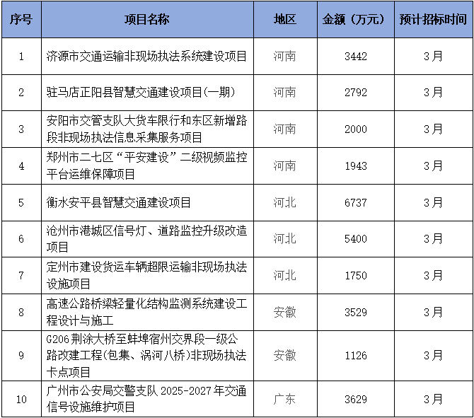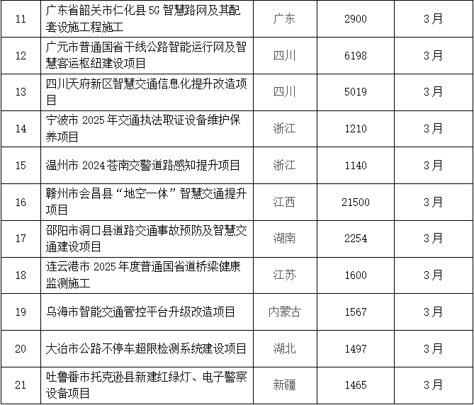根據(jù)賽文研究院的統(tǒng)計,2025年3月,智能交通市場將迎來21個投資金額在1000萬元及以上的招標項目,項目金額合計近8億元。