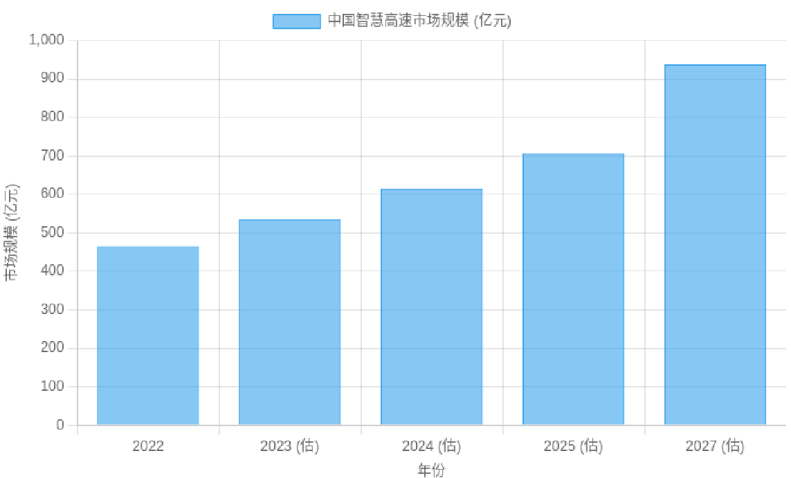 隨著政策的推動和技術的成熟,智慧高速的市場規(guī)模持續(xù)擴大。根據(jù)賽文研究院的預測,僅2025年智慧公路市場數(shù)字化轉型升級的投資就將達到約170億元人民幣。而更廣泛的數(shù)據(jù)顯示,2022年中國智慧高速公路的投資規(guī)模已達到約466億元(中國產(chǎn)業(yè)信息網(wǎng)),并預計將保持穩(wěn)定增長。下圖展示了對中國智慧高速市場規(guī)模發(fā)展趨勢的預測: