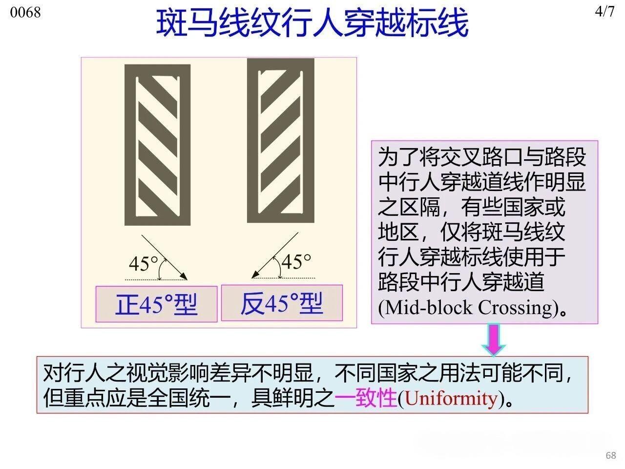 行人在橫穿道路時(shí)專供行人使用的人行橫道標(biāo)線,主要分為平面交叉路口處與路段中兩類場(chǎng)景。其中,平面交叉路口與路段中均可使用梯型、枕木紋型、斑馬紋型、雙塊型(Bar Pair)、直線型(標(biāo)準(zhǔn)型)這五種型式,平面交叉路口傳統(tǒng)上可使用實(shí)心型、虛線型兩類。無(wú)論采用何種標(biāo)線型式,全國(guó)范圍內(nèi)或至少在同一城市內(nèi)保持一致性,以實(shí)現(xiàn)交通控制設(shè)施的一致性(Uniformity)。