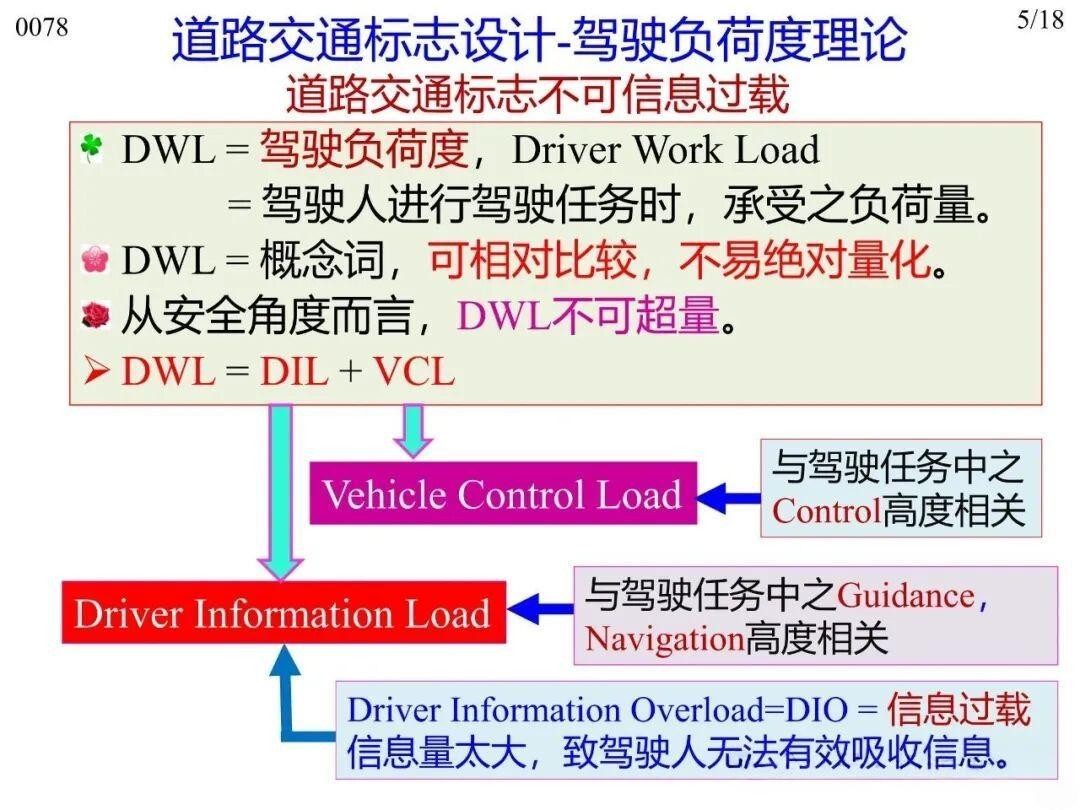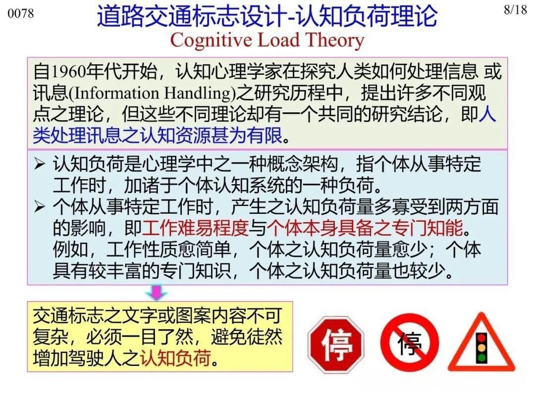 6)認知負荷理論(Cognitive Load Theory):駕駛?cè)嗽隈{駛過程中處理信息的認知資源極為有限,因此交通標志的文字、圖符都應(yīng)一目了然,避免突然增加駕駛?cè)说恼J知負荷;