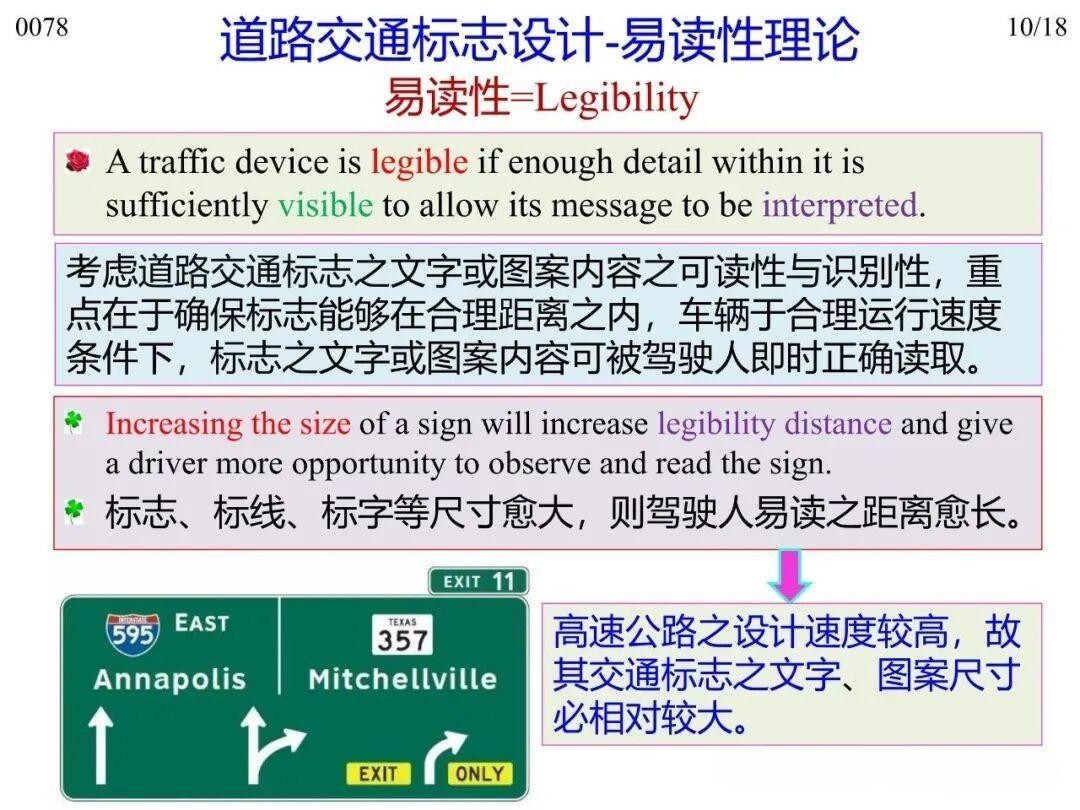 8)易讀性理論(Legibility Theory):設(shè)計應(yīng)確保在合理距離、車輛合理運行速度條件下,駕駛?cè)四芗皶r正確讀取標志的文字或圖符;