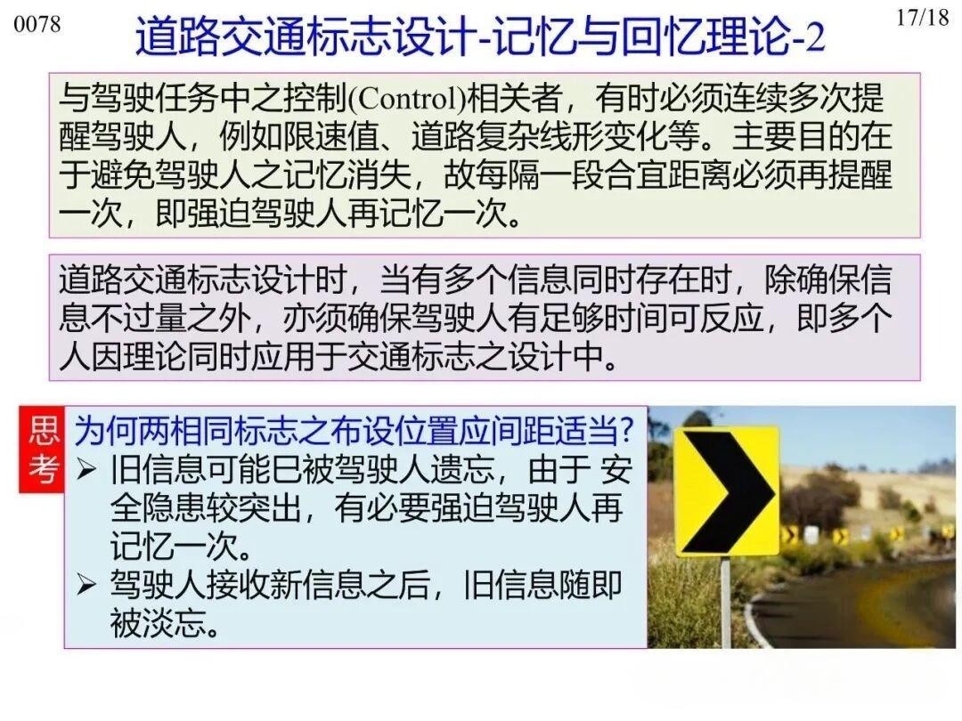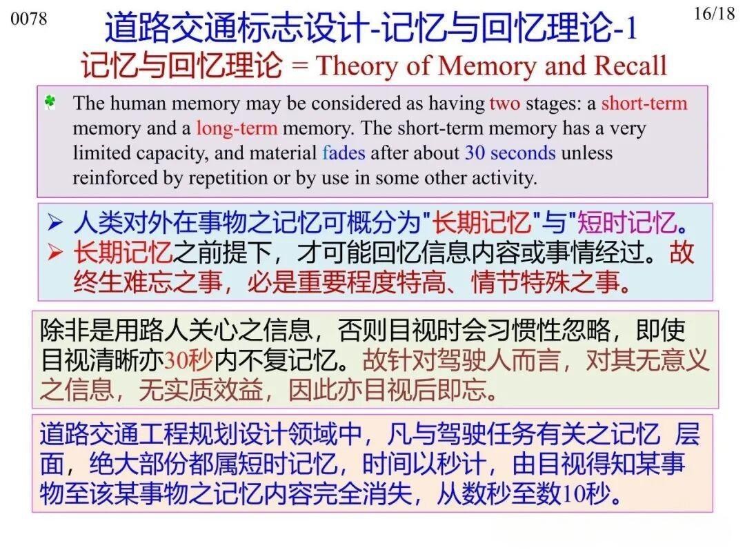 14)記憶與回憶理論(Theory of Memory and Recall):人類記憶分短時記憶和長期記憶,設(shè)計時,限速、道路復雜線形等需連續(xù)提醒的內(nèi)容,需間隔合適距離重復設(shè)置,避免駕駛?cè)硕虝r記憶產(chǎn)生的遺忘,重新喚起短時記憶;