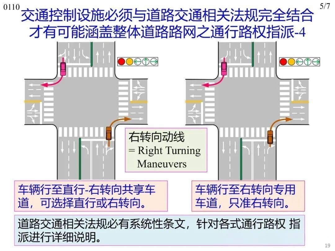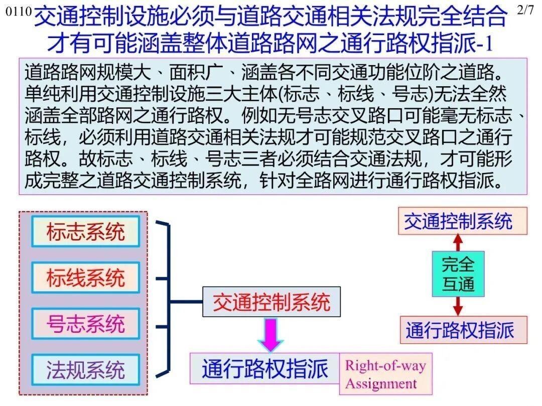 通行路權(quán)的規(guī)范需以交通控制為支撐。道路主體工程完工后,若無交通控制設(shè)備(標志、標線、信號燈三大主體)搭配,車輛無法規(guī)范行駛,通行路權(quán)也難以明確,僅極低位階道路或狹路因功能簡單、流量小可例外。但單一設(shè)備無法承擔全路網(wǎng)路權(quán)分配的功能,路網(wǎng)規(guī)模大且功能位階不同,部分場景(如無信號控制、無標志標線的交叉路口)需結(jié)合道路交通法規(guī),形成“設(shè)備+法規(guī)”的完整系統(tǒng),才能完整實現(xiàn)全路網(wǎng)通行路權(quán)合理分配。