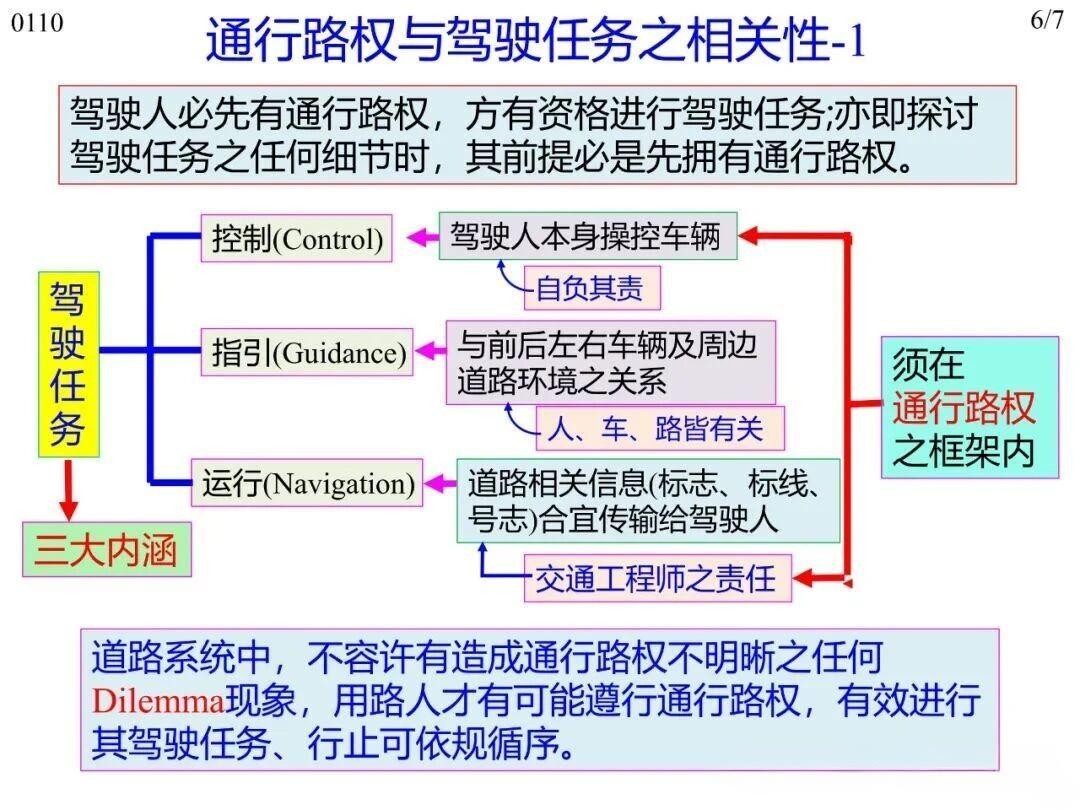 通行路權(quán)是駕駛?cè)蝿?wù)的前置條件,駕駛?cè)诵柘葥碛新窓?quán)(含時間與空間路權(quán)),才能開展駕駛?cè)蝿?wù)。駕駛?cè)蝿?wù)的控制(Control)、指引 (Guidance,及時反應(yīng))、運行(Navigation,指引)三大內(nèi)涵,均需在路權(quán)框架內(nèi)執(zhí)行:控制(Control)環(huán)節(jié)駕駛?cè)瞬倏剀囕v需以有路權(quán)為前提且自負其責(zé);指引(Guidance,及時反應(yīng))環(huán)節(jié)需依路權(quán)優(yōu)先級處理與周邊的關(guān)系;運行(Navigation,指引)環(huán)節(jié)則通過接收道路信息確認路權(quán)范圍。