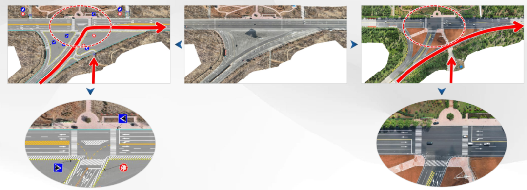 拆除環(huán)形交叉口后,交叉口組織設(shè)計主要圍繞四點思路展開:簡化路口結(jié)構(gòu)、保障主線效率、減少交通沖突、提升慢行安全。