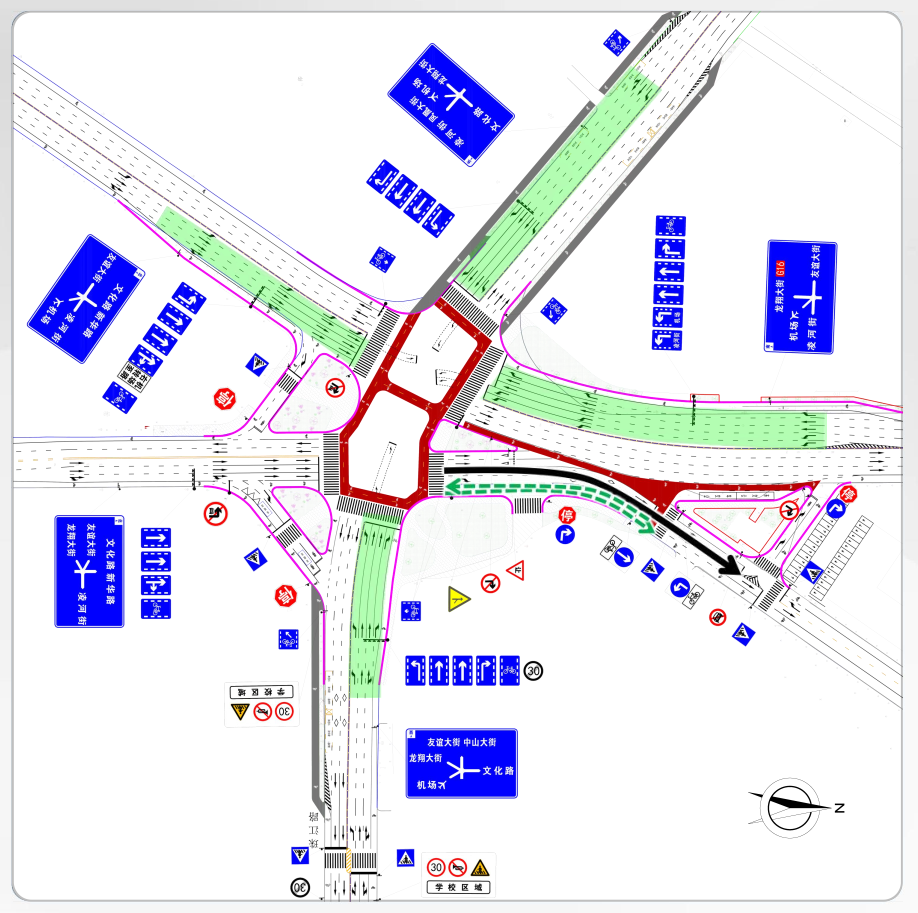 減少交通沖突:將龍山街北段局部設(shè)置為南向北單行,在機(jī)場路進(jìn)口實施禁左,在龍山街南段進(jìn)口實施禁止跨出口右轉(zhuǎn),在此基礎(chǔ)上通過信號燈控制減少沖突點。